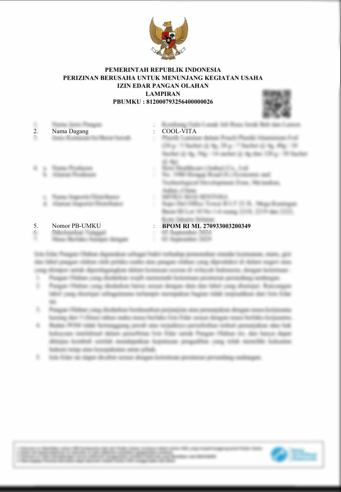 đ˘Semua produk Cool-Vita sudah tersertifikasi BPOM, HALAL, dan GMP, kami menjamin semua produk kami aman dan tersedia asuransi dari Sinar Mas, dengan syarat dan ketentuan yang berlaku.